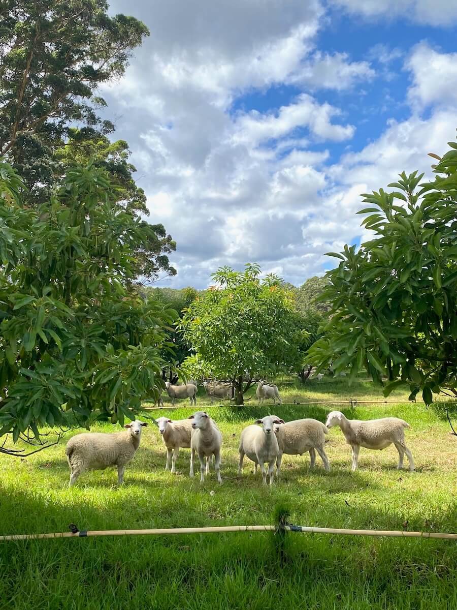 Some of our Ultrawhite sheep and lambs call the avocado orchard home, enjoying the shade while playing an important role in our organic system.